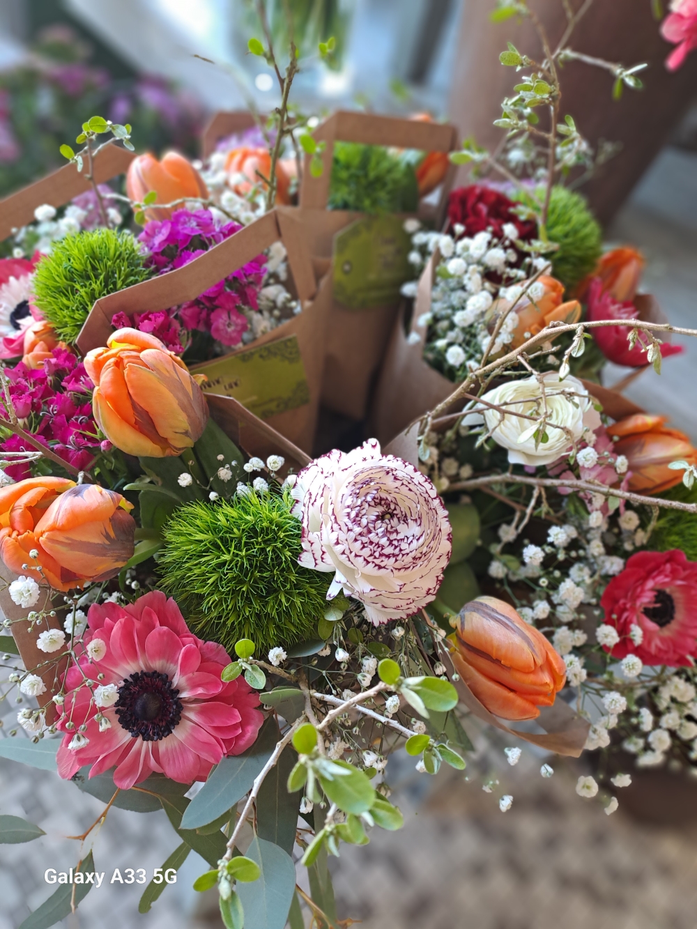bouquet champêtre composées de tulipes , renoncules , anémones , gypsophile ( bien sur certaines variétés pourrons être modifiées en fonction de notre stock en boutique et de vos commandes plus ou moins tardive !!!)